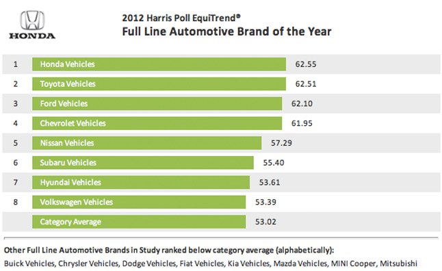 Tačiau tikrasis siurprizas buvo Honda, kuri užėmė pirmąją vietą 2012 metų „Visos Linijos Automobilių Prekių Ženklo Metų” kategorijoje, aplenkdama tiek Toyota, tiek Ford. Toyota pakilo į antrąją vietą iš ketvirtosios, o Ford nukrito iš pirmosios į trečiąją. Tai tik parodo, kaip Honda sugebėjo užkariauti vairuotojų širdis savo patikimumu ir naujoviškumu.